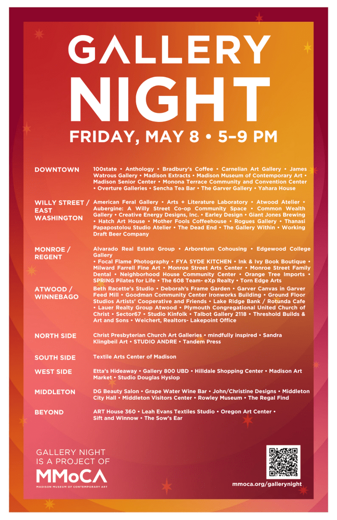 Join the Hatch team for a Gallery Night reception held at Hatch Art House on Friday, May 8th from 5-9pm. Our reception coincides with MMoCA’s citywide Gallery Night.