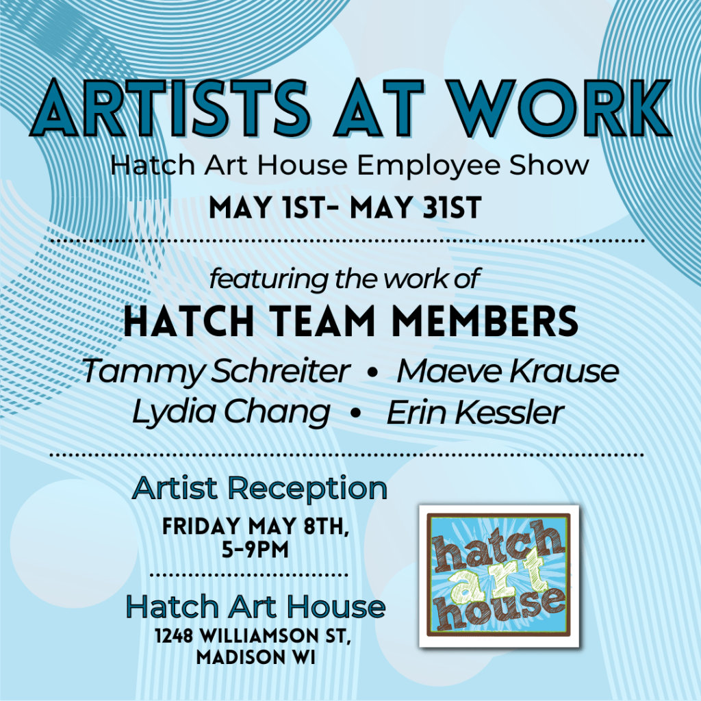 Hatch’s artist employees practice a wide variety of art styles, and Artists at Work will consist of a selection of works from each Hatch employee, including paintings, fiber art, jewelry, and more! Hatch’s Employee Art Show will showcase the work of Tammy Schreiter, Maeve Krause, Lydia Chang, and Erin Kessler