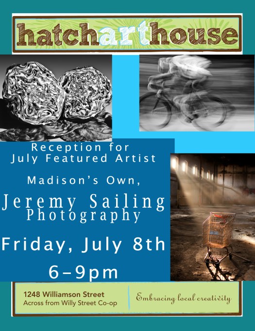 Madison’s own, Jeremy Sailing is this months featured artist.  Jeremy’s been very busy with lots of new projects! One of his latest endeavors is a series on dance and movement. The final photos are stunning! Today he stopped by Hatch with his newest works. Here are a couple of my favorites and a link to the Reception. We will be serving adult beverages;)  http://www.facebook.com/event.php?eid=165786440155149